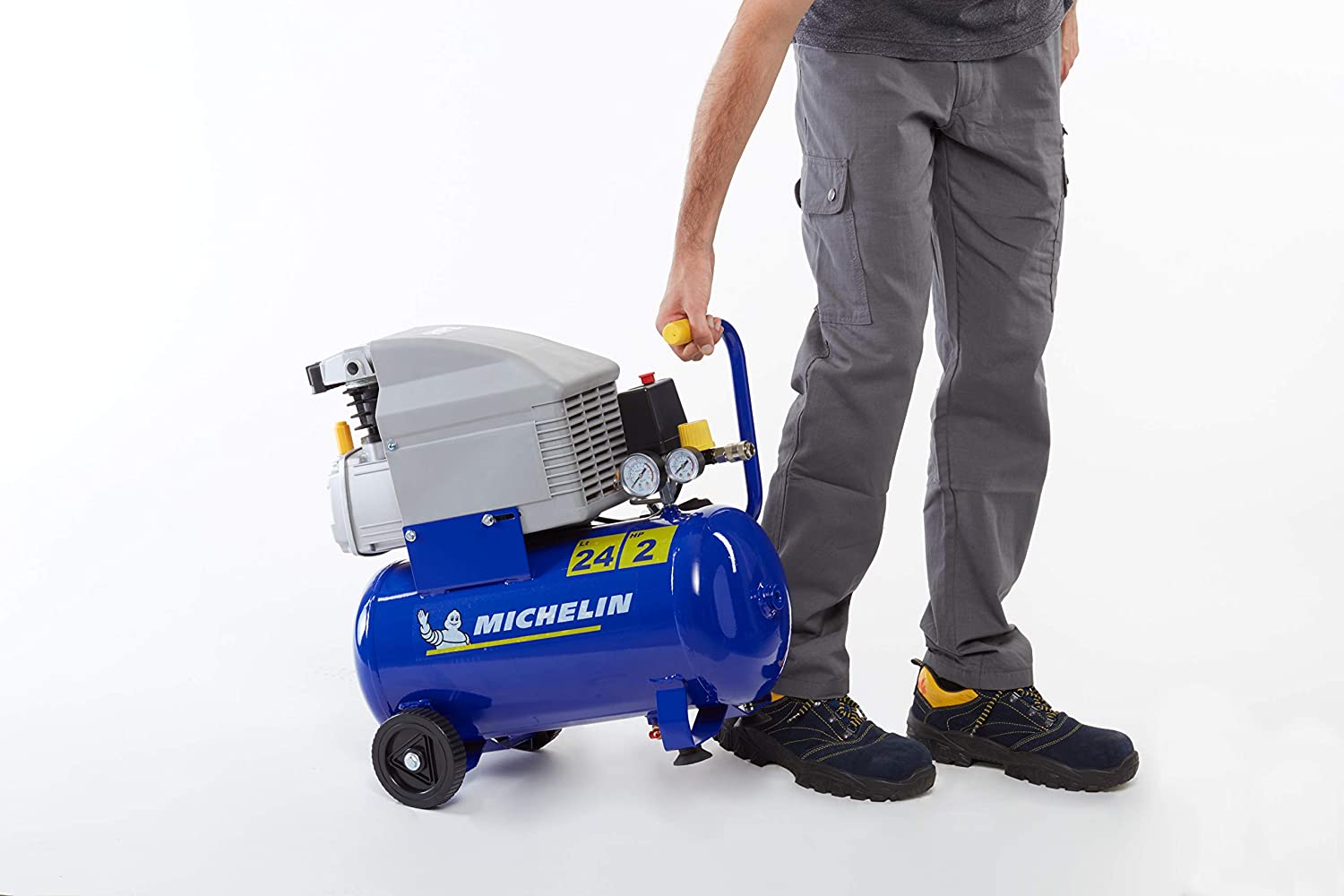 Compressor tank: 24 Liter Max. operating pressure: 8 bar Air displacement: 170 L/min Pump unit RPM: 1310 RPM Lubrication: Oil Pump unit type: Coaxial Rated output: 2 HP Activation: Single-phase noise level: 80 dBA
