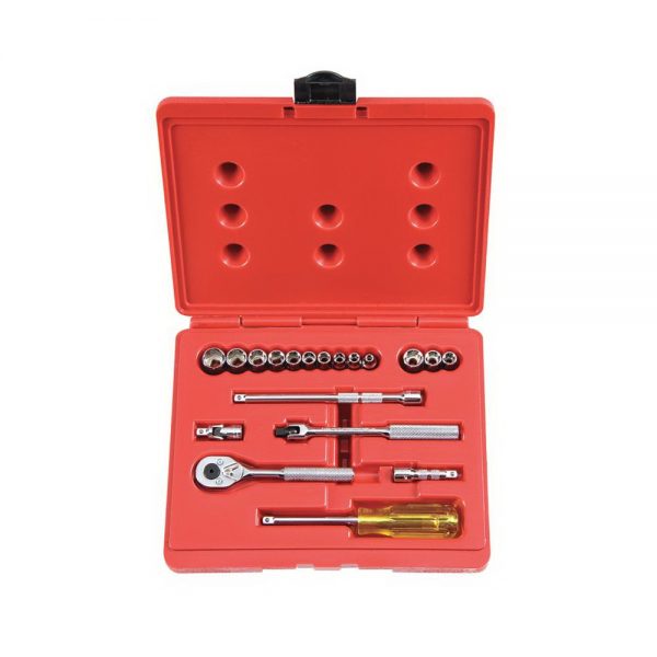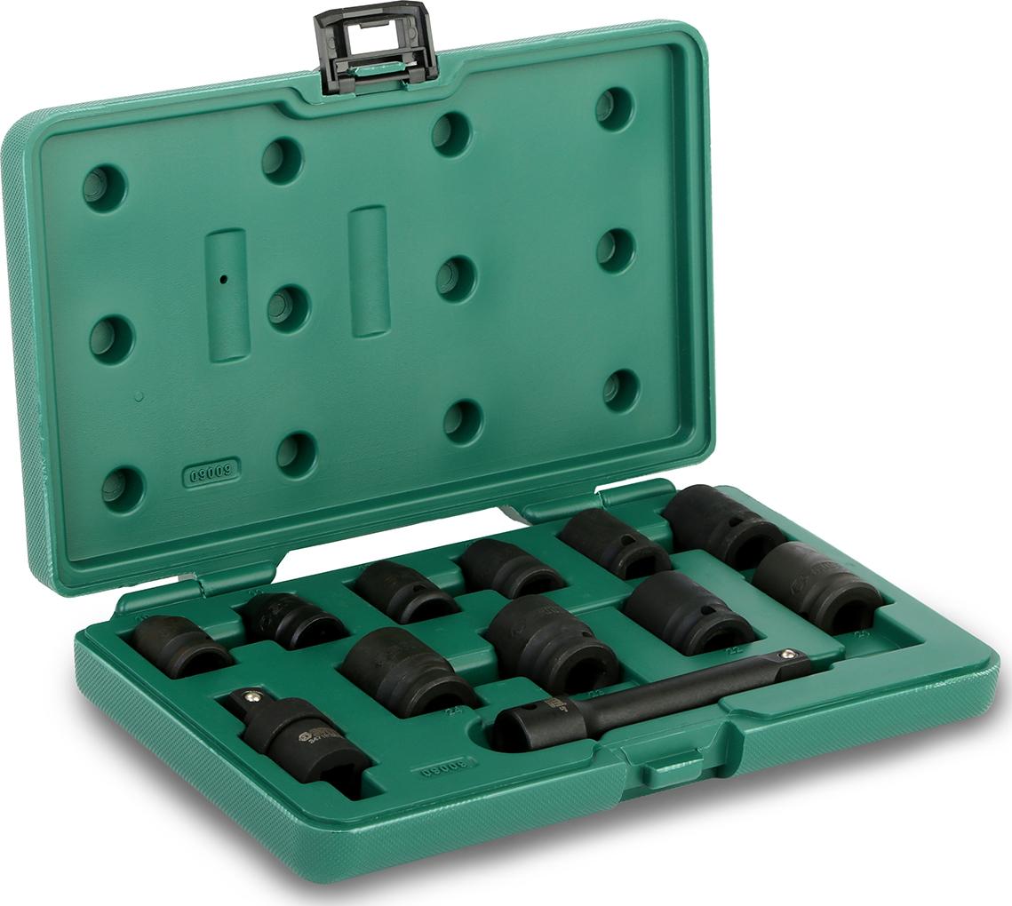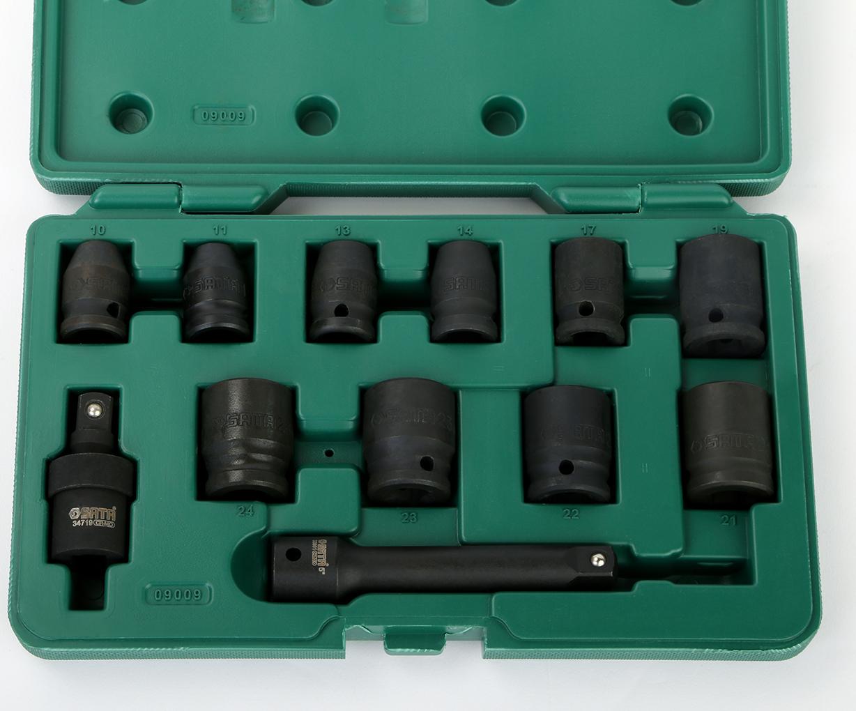 * 10-piece 12.5MM series impact socket set (10, 11, 13, 14, 17, 19, 21, 22, 23, 24MM) * 1-piece 12.5MM series impact universal joint * 1-piece 12.5MM series impact extension bar (5″)