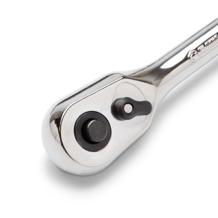 Ratchet flush mounted reversing lever allows user to change direction with one hand without removing the wrench