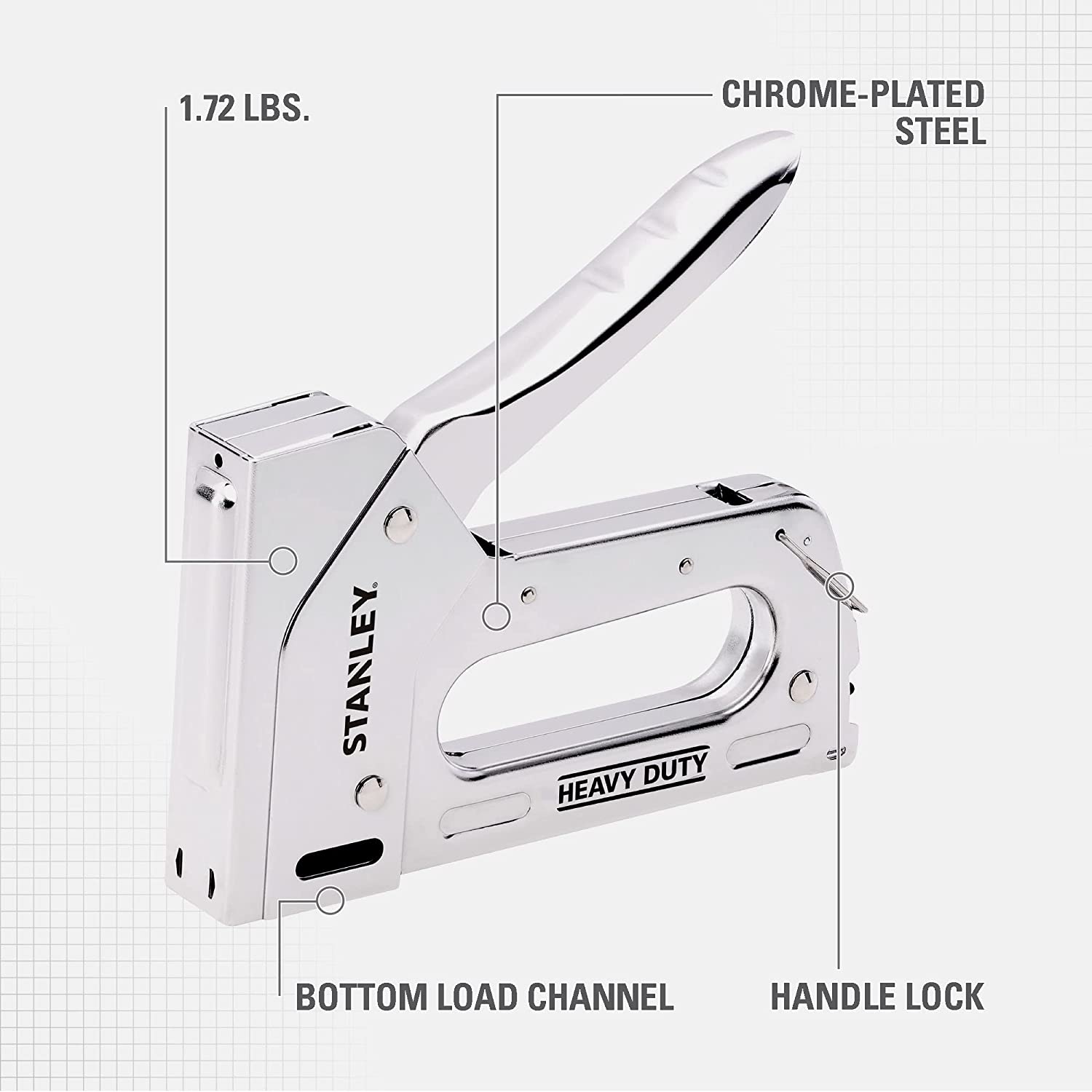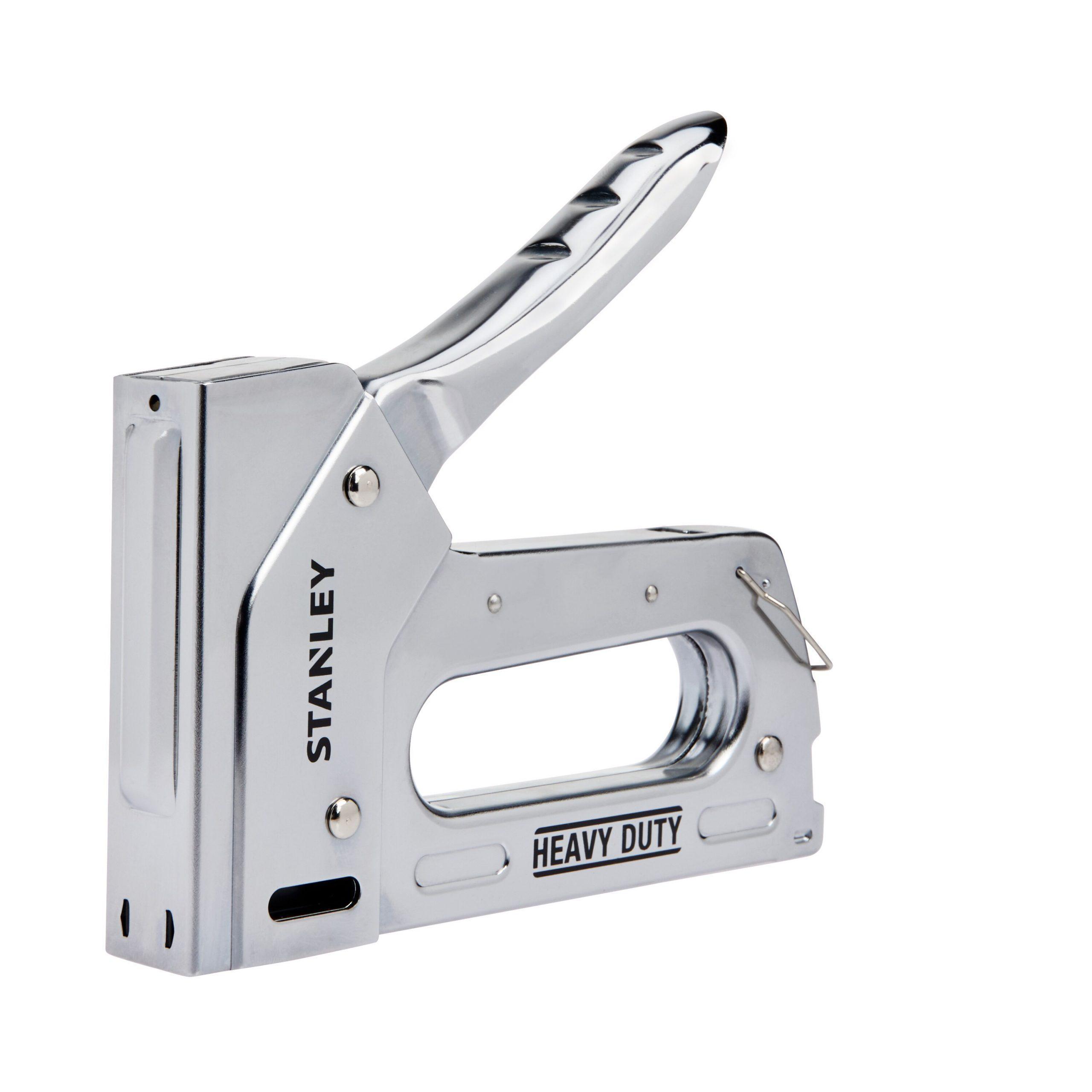 The heavy-duty staple gun is durable and reliable. Its chrome-plated all steel construction is tough enough to survive dusty, dirty job-sites. With its bottom load channel to load staples for fast and its handle lock for easy storage, this tool has enough power to drive staples into thick dense wood, day in and day out, all day long.